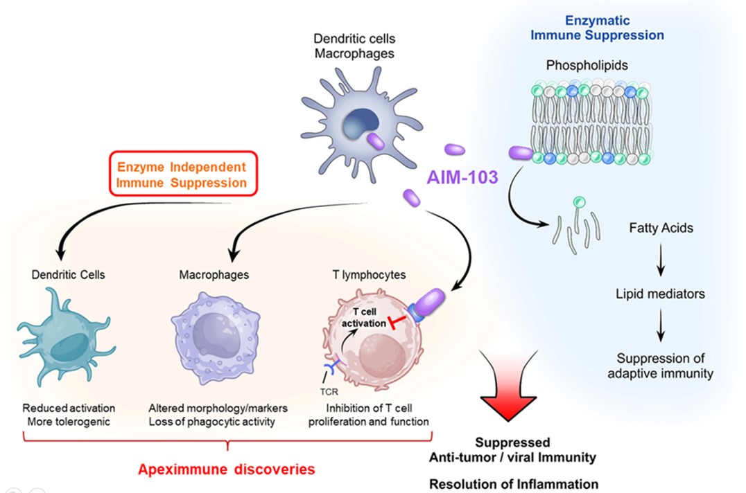Primarily expressed by dendritic cells and macrophages, AIM-103 is a member of the secreted phospholipase A2 family whose enzymatic activity specifically shifts the microenvironmental lipid metabolite balance towards a pro-resolving state by suppressing pro-inflammatory cytokines and dampening DC activation. Pioneering research at Apeximmune has further uncovered novel immune suppressive mechanisms of AIM-103 that are completely independent of its catalytic activity. These newly discovered enzyme-independent functions include inhibition of T cell proliferation and IL-2 expression through direct T cell binding, suppression of macrophage differentiation and phagocytic activity, and perturbation of DC maturation and activation.