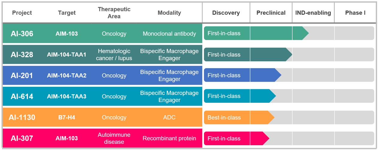 AI-306 is a first-in-class antibody designed to bind AIM-103 with high affinity and inhibit both its enzyme dependent and independent immune suppressive functions, thus leading to enhanced anti-tumor immunity. AI-306 is expected to be highly complementary to anti-PD-1 therapies, as AIM-103 expression has been observed to be upregulated in patients following anti-PD-1 treatment, particularly in PD-1 refractory patients.